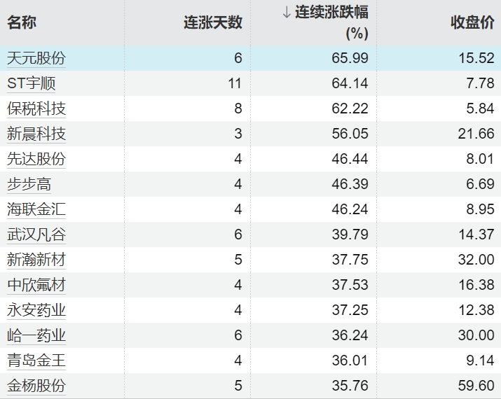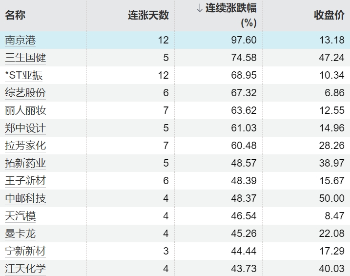 截至6月11日收盘正版炒股软件,89只个股连续上涨5个交易日及以上。涛涛车业连续上涨12个交易日,ST联合、昂利康等连续上涨9个交易日。从累计涨幅来看,共创草坪连涨期间累计涨幅达96.76%,昂利康连涨期间累计涨幅达80.57%。